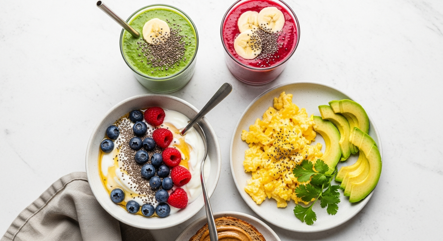 High protein breakfasts without eggs include: Greek yogurt protein bowl (45g protein), cottage cheese parfait (30g protein), overnight oats with protein powder (38g protein), chocolate PB protein shake (48g protein), smoked salmon and cottage cheese toast (34g protein), and kefir berry smoothie (35g protein). All are under 500 calories and require 2–5 minutes of preparation.